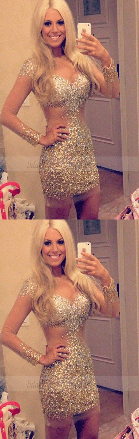 Long Sleeves Homecoming Dress,Tulle Beaded Prom Dresses