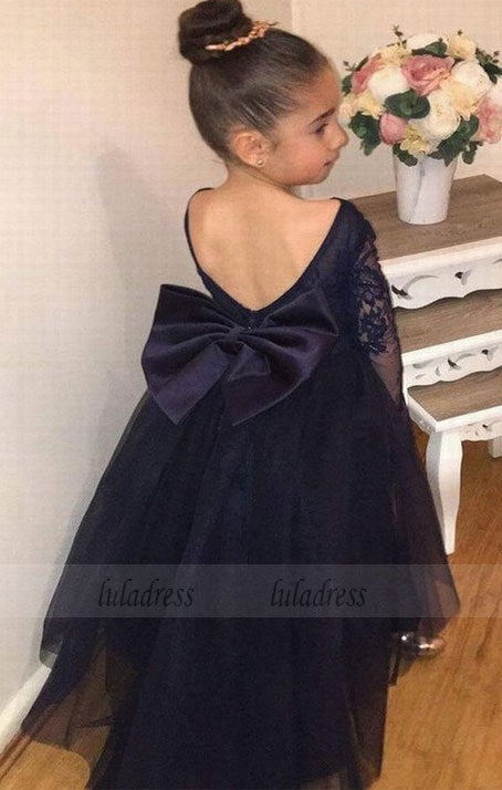 Lovely Dark Navy Tulle Backless Flower Girl Dresses with Long Lace Sleeves