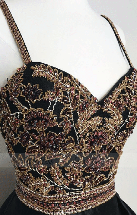 Spaghetti Straps Satin Black Prom Dresses,cheap Evening Gown