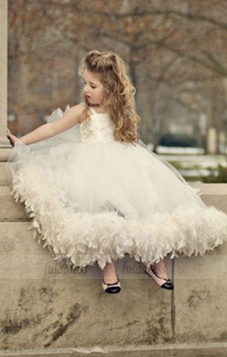 Spaghettis Tulle Feathers Cute Flower Girl Dresses Long Girl's Formal Dresses