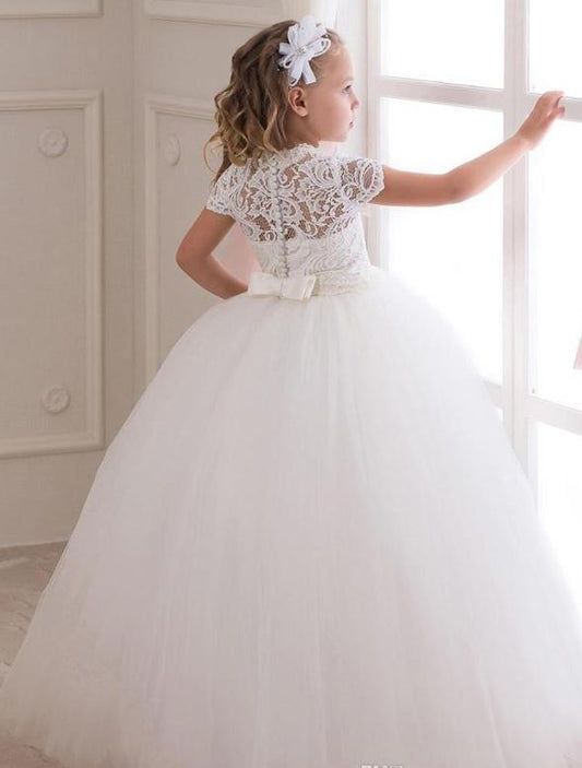 Long Ball Gown Flower Girl Short Sleeves Sashes Lace Dress