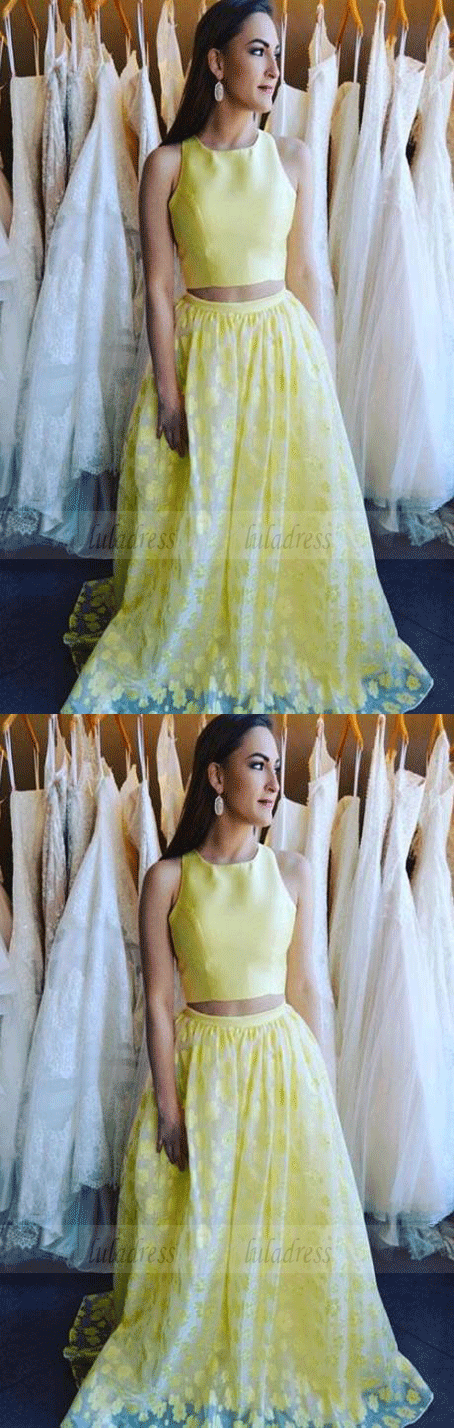 Two Piece Round Neck Floor-Length Daffodil Printed Prom Dress
