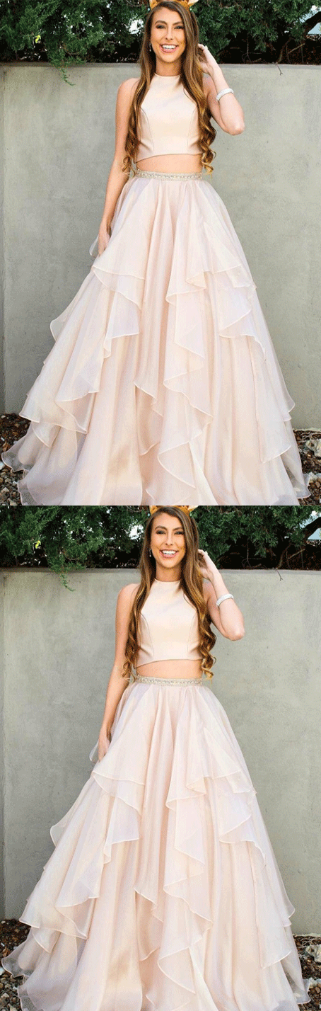 Two-Piece Halter Beaded Bodice Long Prom Dress