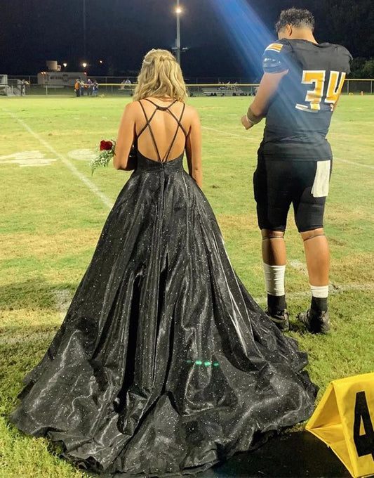 Sevy Glitter Black V Neck Spaghetti Straps Long Prom Dresses