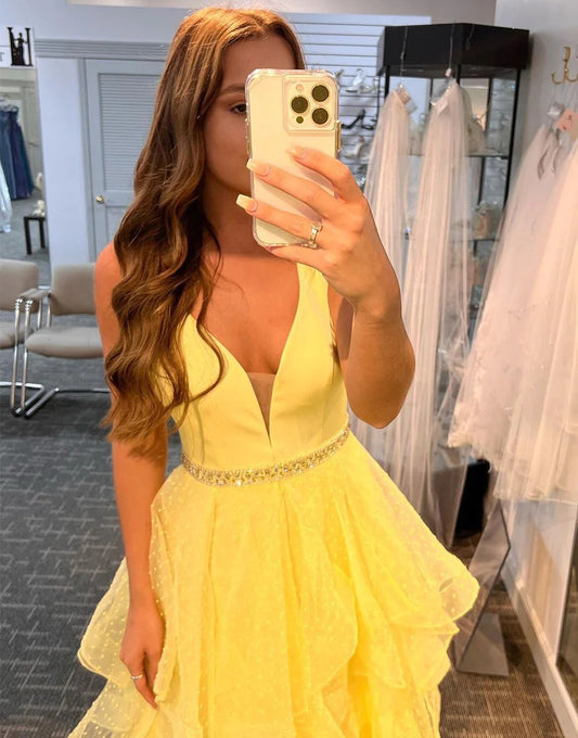 A-Line Tiered Ruffles Light Yellow Tulle Prom Dresses,BD930661