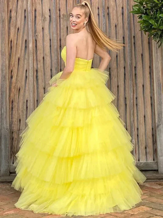 Yellow Layered Long Tulle Sweetheart Prom Dresses