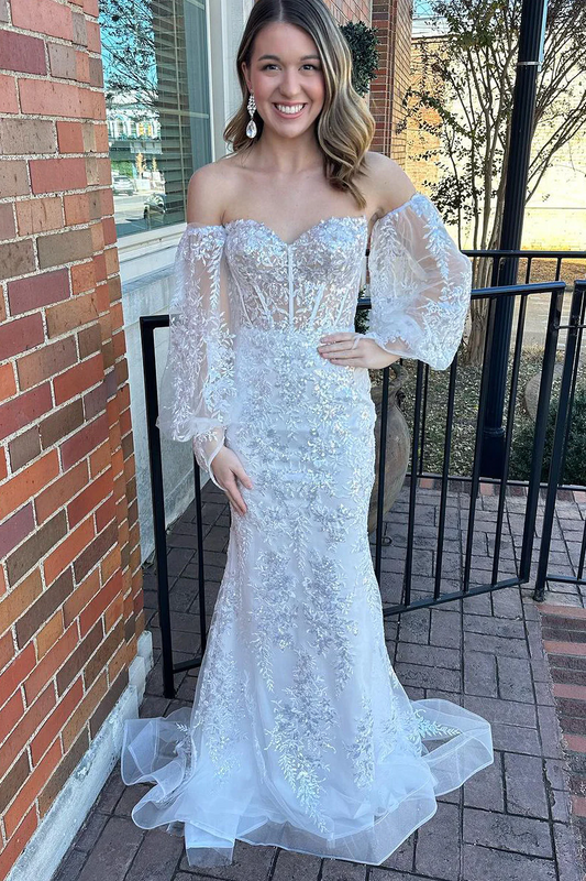 White Mermaid Lace Long Sweetheart Prom Dresses