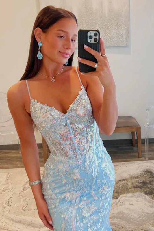 Light Blue Sequins Appliques V Neck Long Prom Dresses