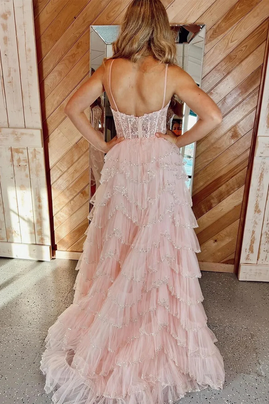 Light Pink Spaghetti Straps Long Sequined Layers Floral Prom Dresses