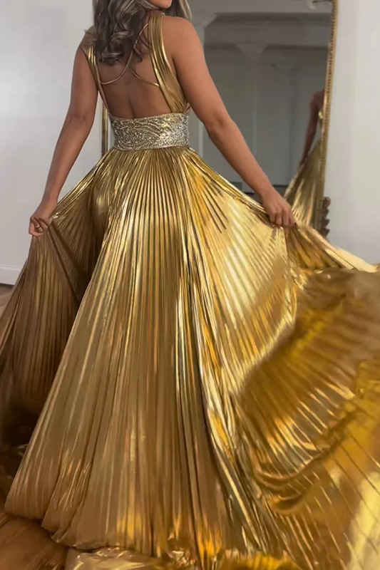 Glitter Golden Beaded Metallic Long A-Line Prom Dresses