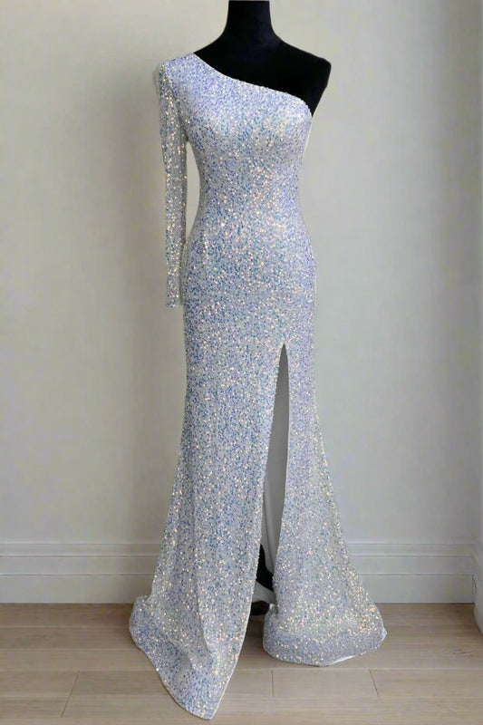 One Shoulder White Sequins Long Prom Dresses