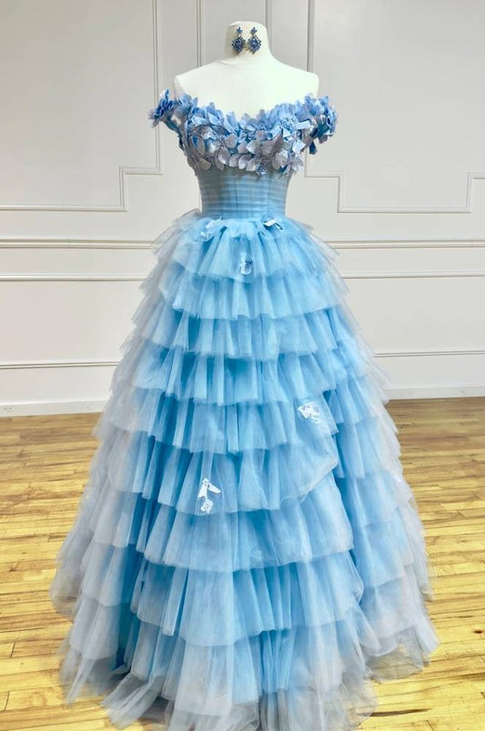 Off the Shoulder Tulle Pink Tiered Long Prom Dresses