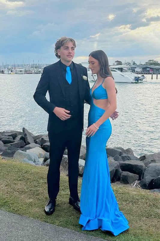 two pieces evening Dress,blue Prom Dress,beaded prom dress,long prom dress,side slit evening dress