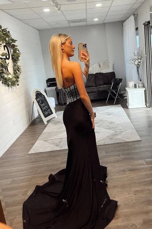 Sexy black beaded long slit prom dresses on sale