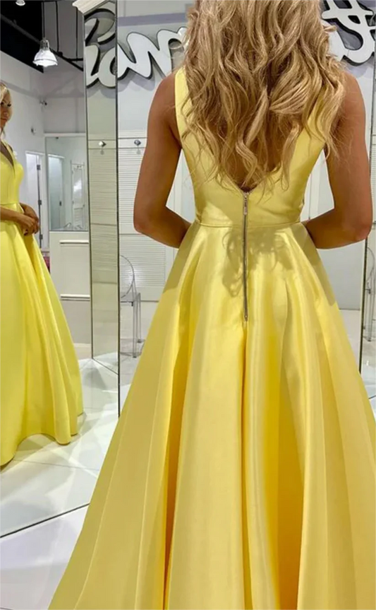 A-Line Satin Long V Neck Prom Dresses Sleeveless Formal Party Dress
