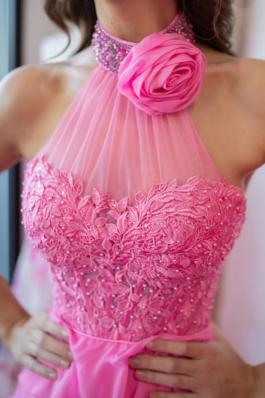 Pink Halter Tiered Chiffon Long Prom Dresses with Appliques