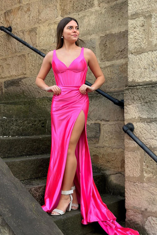 Fuchsia V Neck Mermaid Long Prom Dresses with Slit