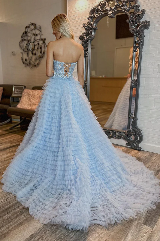 Light Blue Strapless Ruffle Tiered Tulle Long Prom Dresses with Appliques
