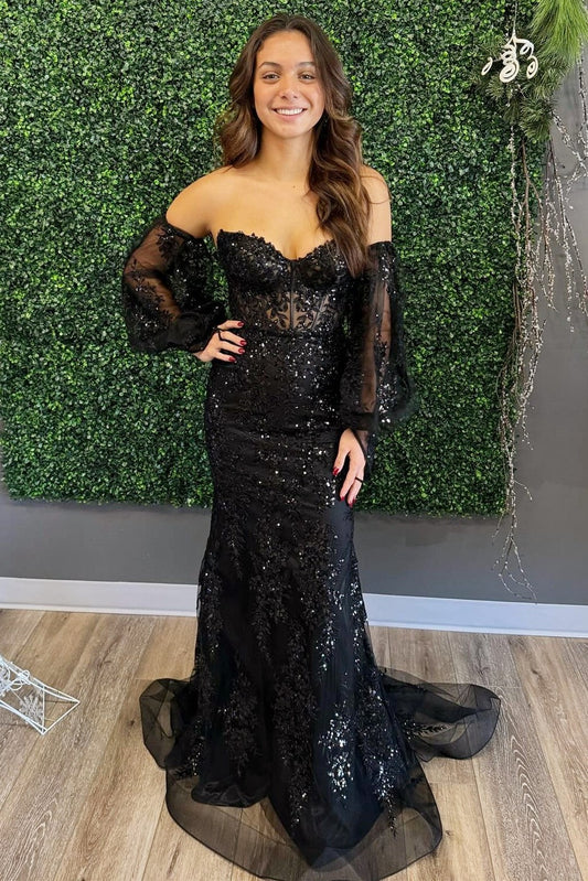 Mermaid White Off The Shoulder Sequins Lace Long Prom Dresses with Long Sleeves