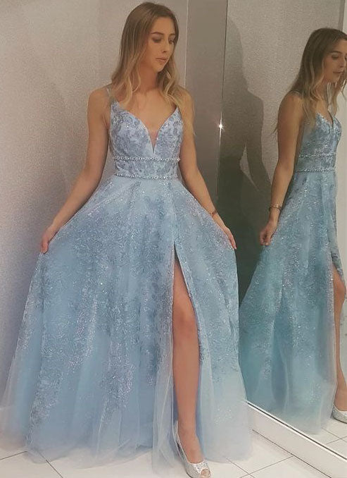 A-Line V-neck Floor-Length Light Blue Prom Dress with Appliques Beading