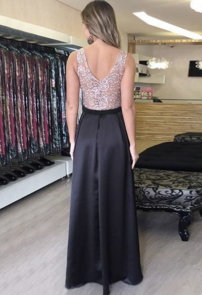 A-Line Long Black Satin Prom Dresses with Beading Lace Pleats