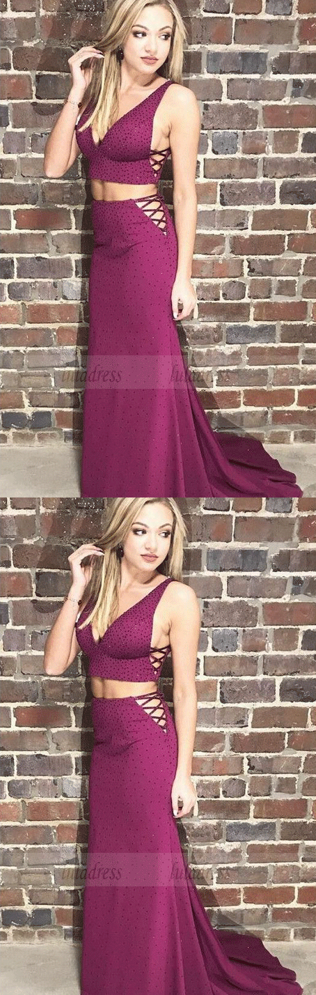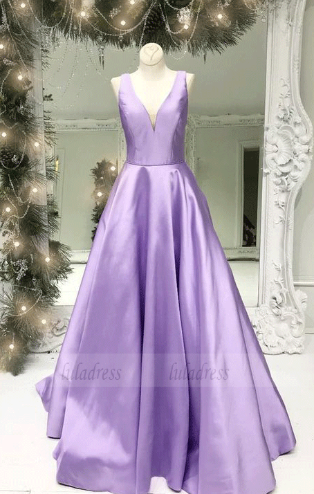 V-Neck Sweep Train Prom Dress,Grape Prom Dress with Beading