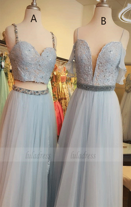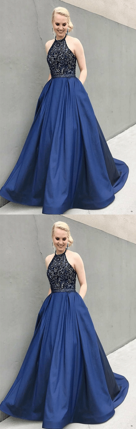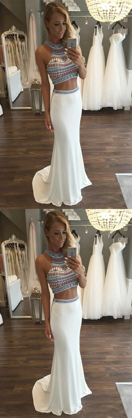 Two-Piece Halter Beaded Bodice Long Prom Dress