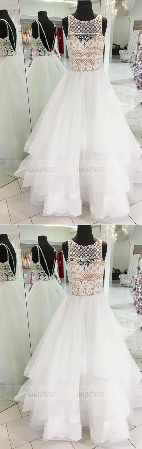 A-Line V-Neck Sleeveless White High Low Prom Dresses