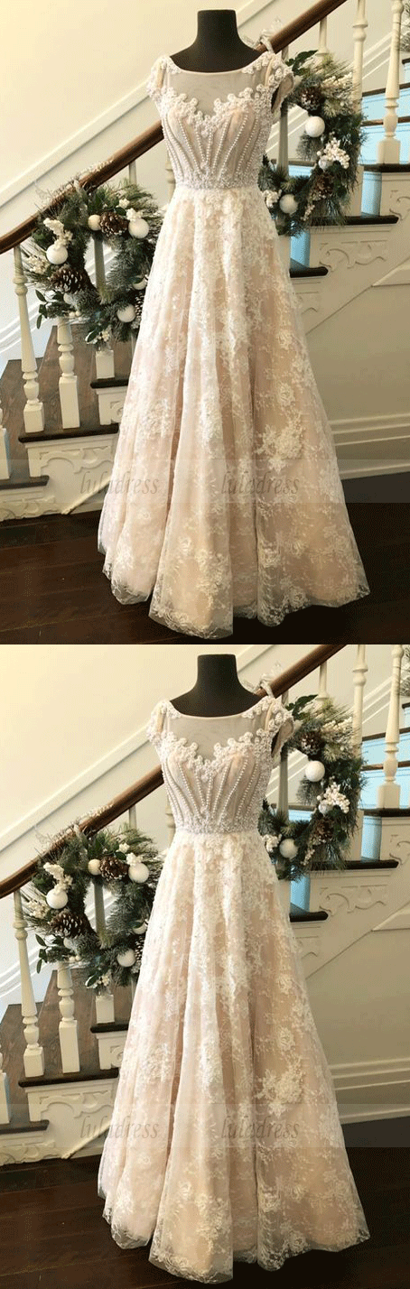 A-Line Bateau Cap Sleeveless Lace Long Prom Dress With Beading