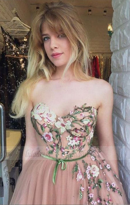 cute sweatheart a line tulle long prom dresses with flower , blush ball gown graduation party dress for teens