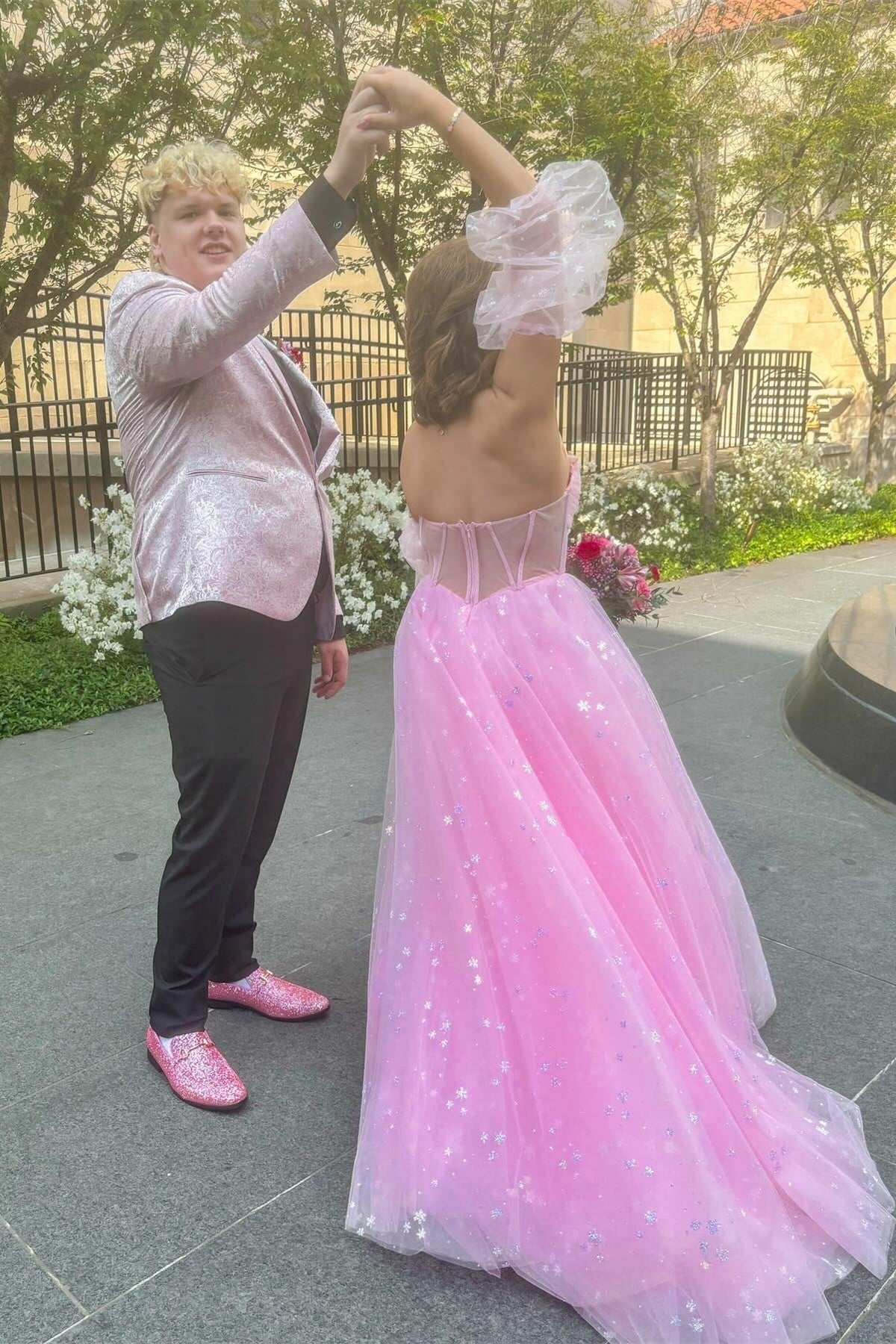 This A Line Sparkly Blue Tulle Long Sweetheart Prom Dress is the epitome of elegance and glamour. Made with high-quality tulle, the dress features a flattering sweetheart neckline and a stunning A-line silhouette. Perfect for prom or any special occasion, this dress is sure to make you stand out with its eye-catching sparkles and timeless design. Channel your inner starlet and make a statement with this stunning dress.