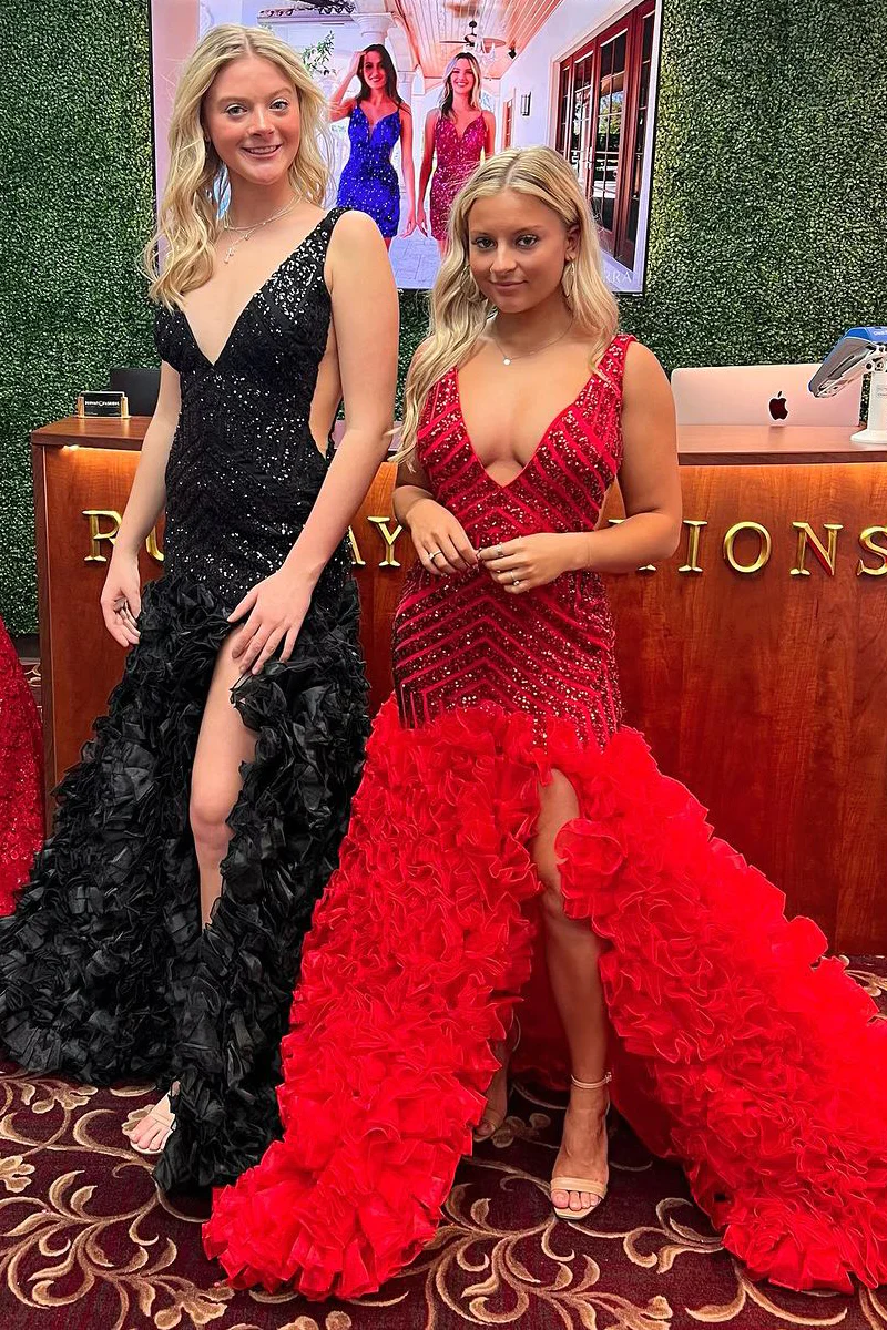 Black V Neck Sequins Mermaid Long Prom Dresse