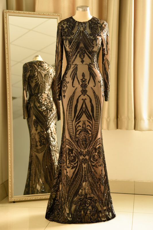 Elegant Jewel Sequined Mermaid Prom Dress Long Sleeves Appliques Party Dress