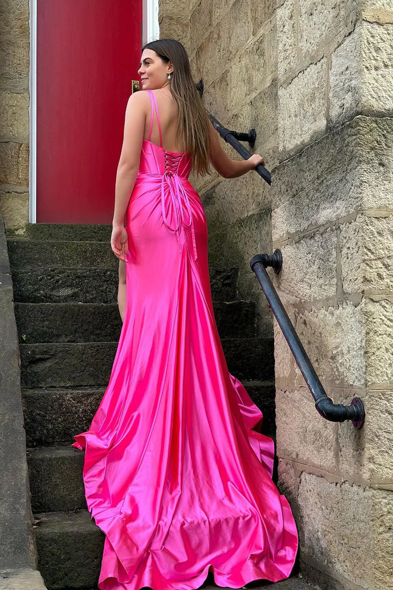 Fuchsia V Neck Mermaid Long Prom Dresses with Slit