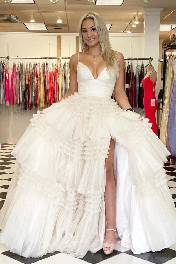 Ivory Tulle Ball Gown Spaghetti Straps Split Prom Dresses, Evening Gown