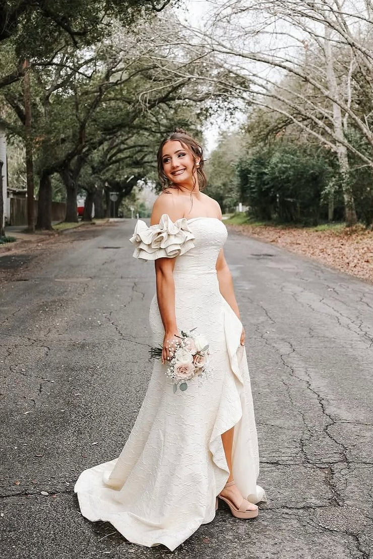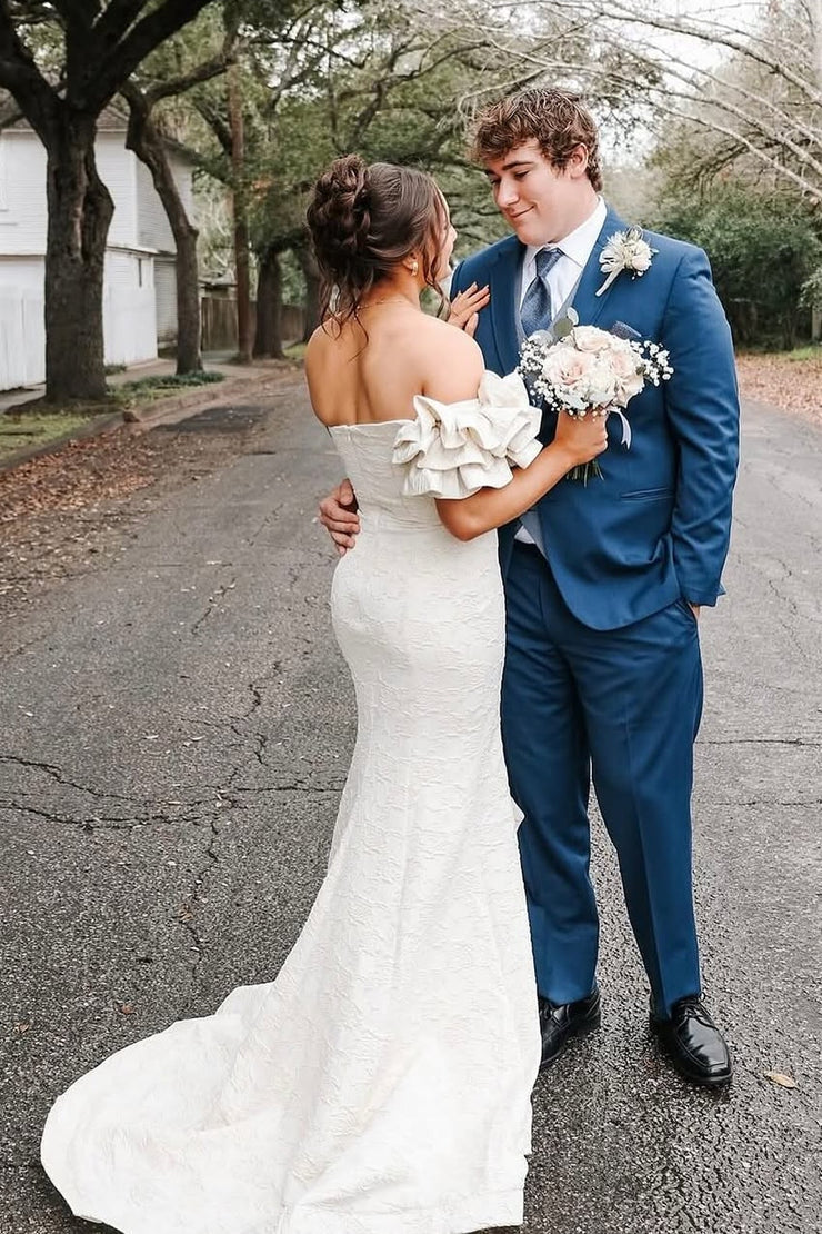 This mermaid strapless prom dress is crafted with a luxurious jacquard satin material. The elegant and figure-flattering silhouette will make you stand out at any prom or formal event. With its strapless design, this dress is perfect for showing off your shoulders and neckline. Experience the perfect combination of sophistication and style.