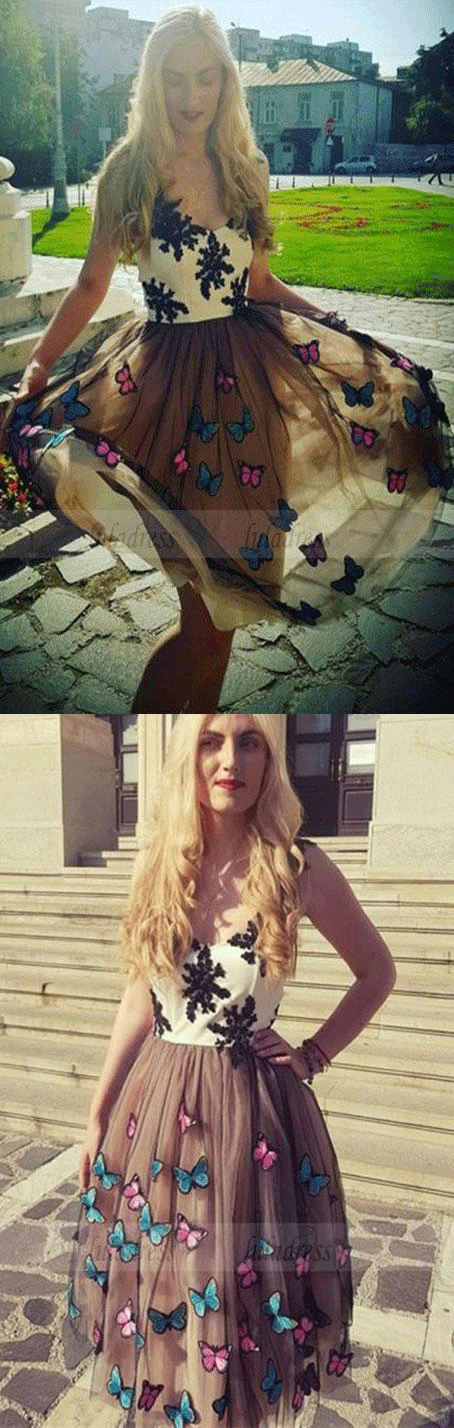 modest brown tulle short prom dresses with appliques,unique knee length party dresses