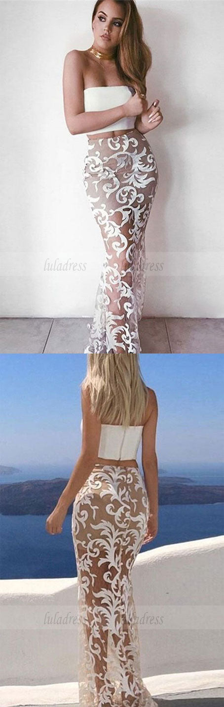 modest two piece,simple strapless sheer lace party dresses,sexy evening gowns