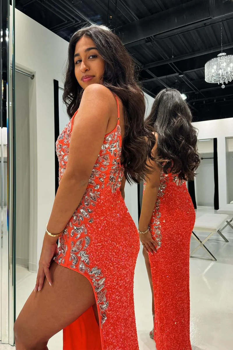 Orange Sequin Lace V Neck Mermaid Long Prom Dresses