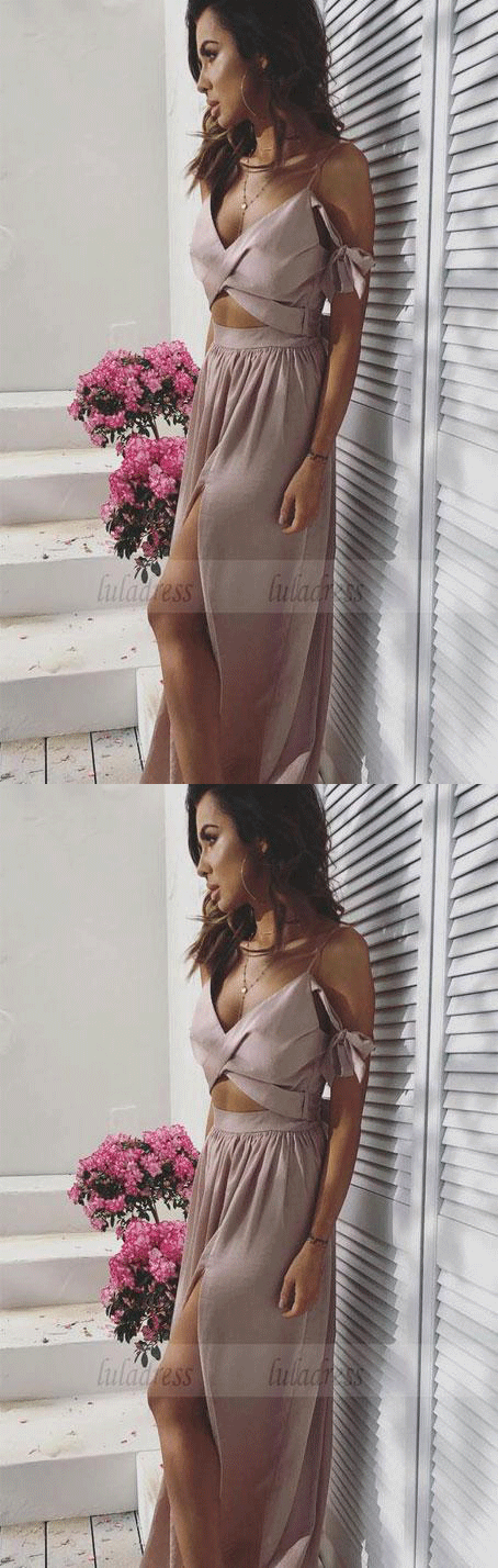 Two Piece Spaghetti Straps Floor-Length Blush Chiffon Prom Dress with Split